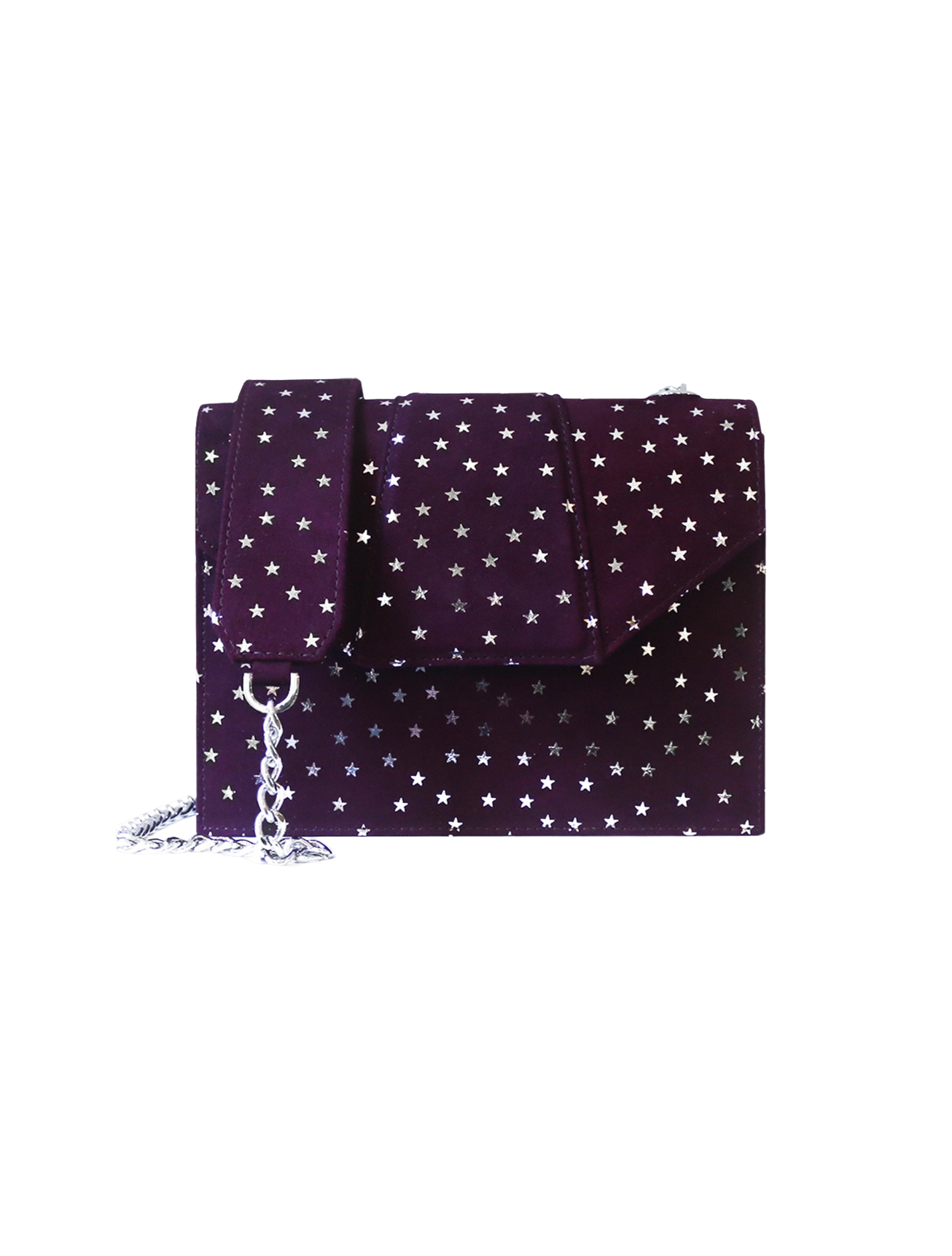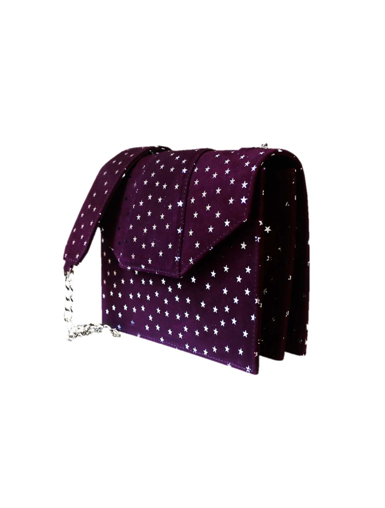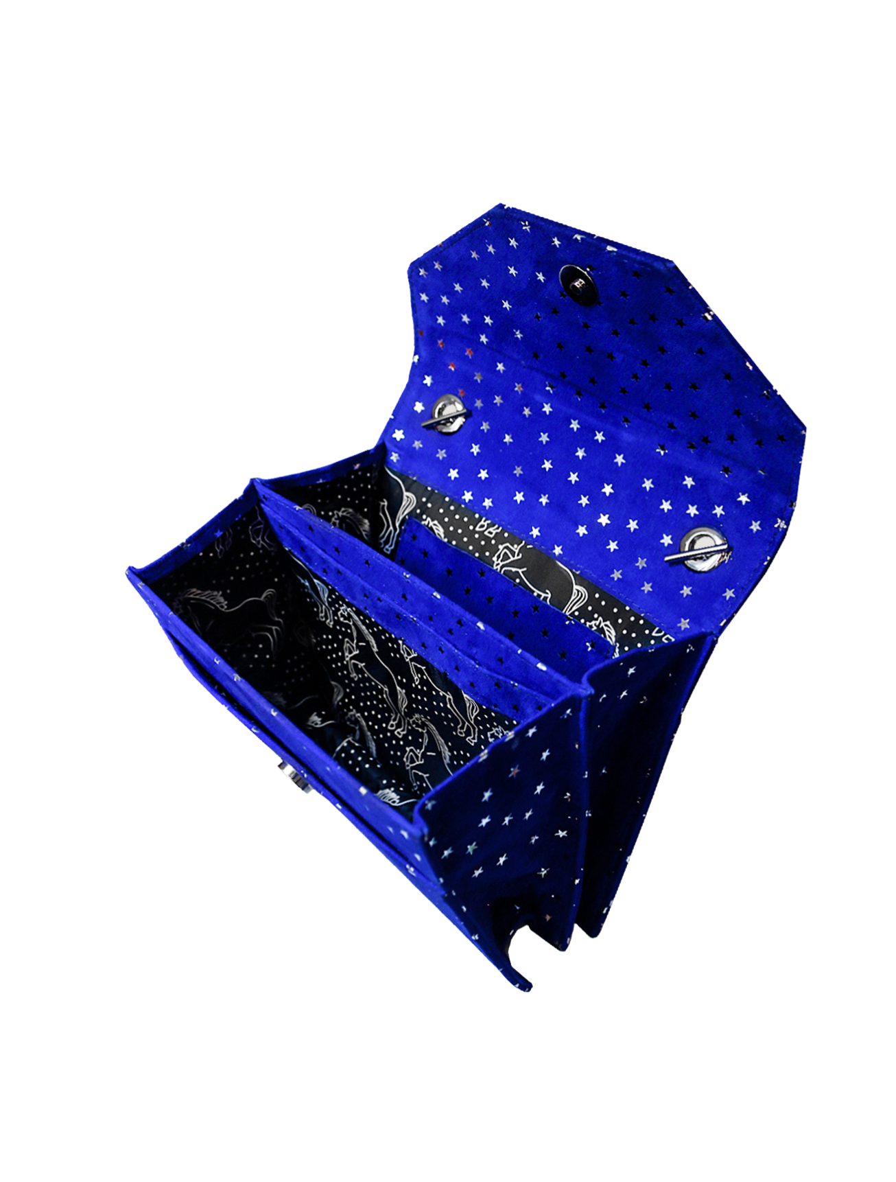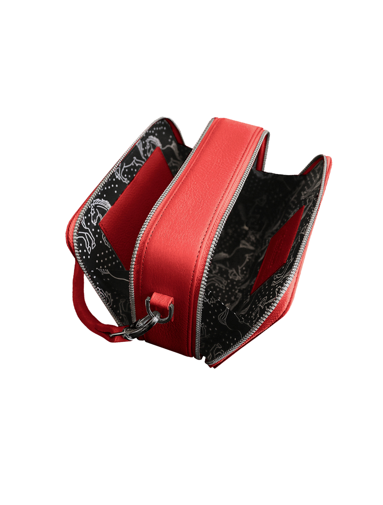 Medium bag with a geometric structure, made of cowhide leather. Includes adjustable and detachable strap for use on the shoulder or crossbody. Lined with our iconic print, it closes with a magnet clasp and has silver hardware.