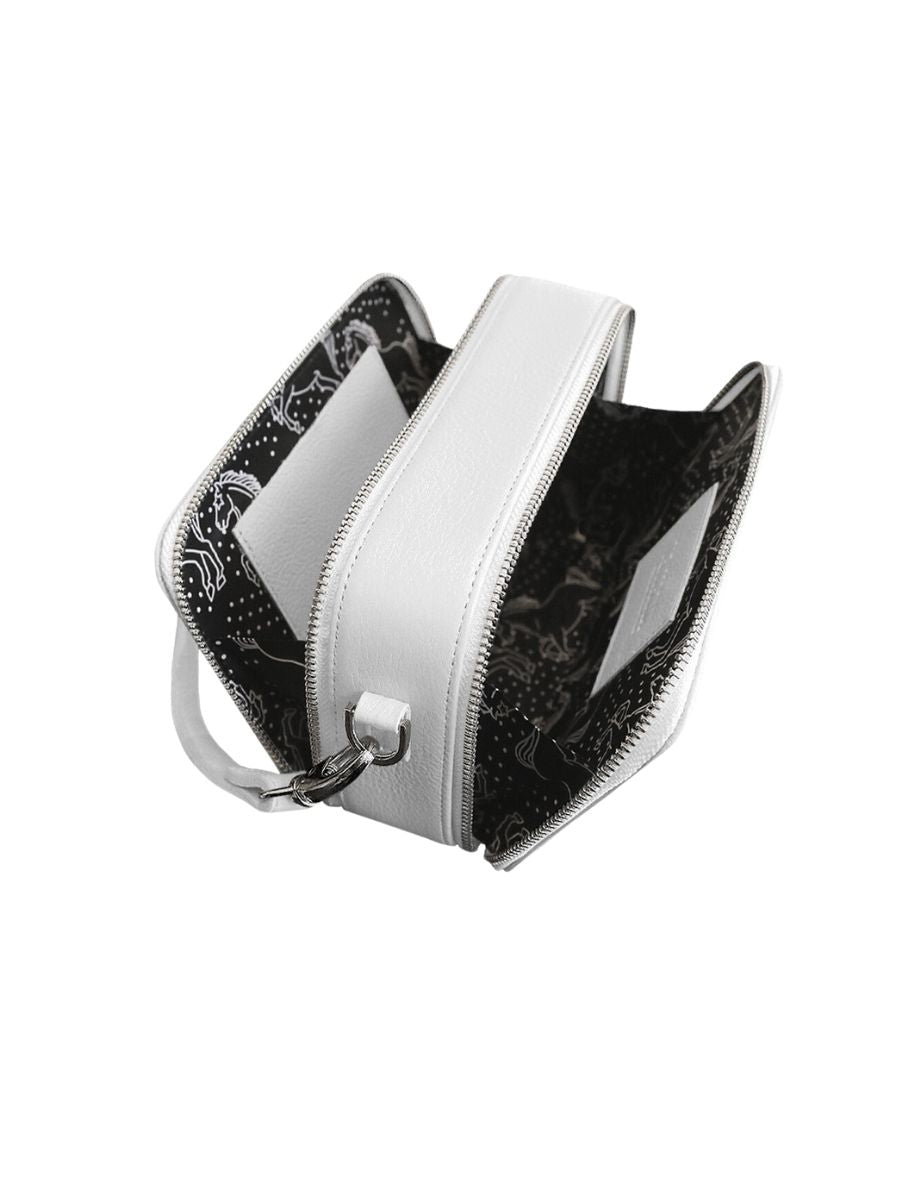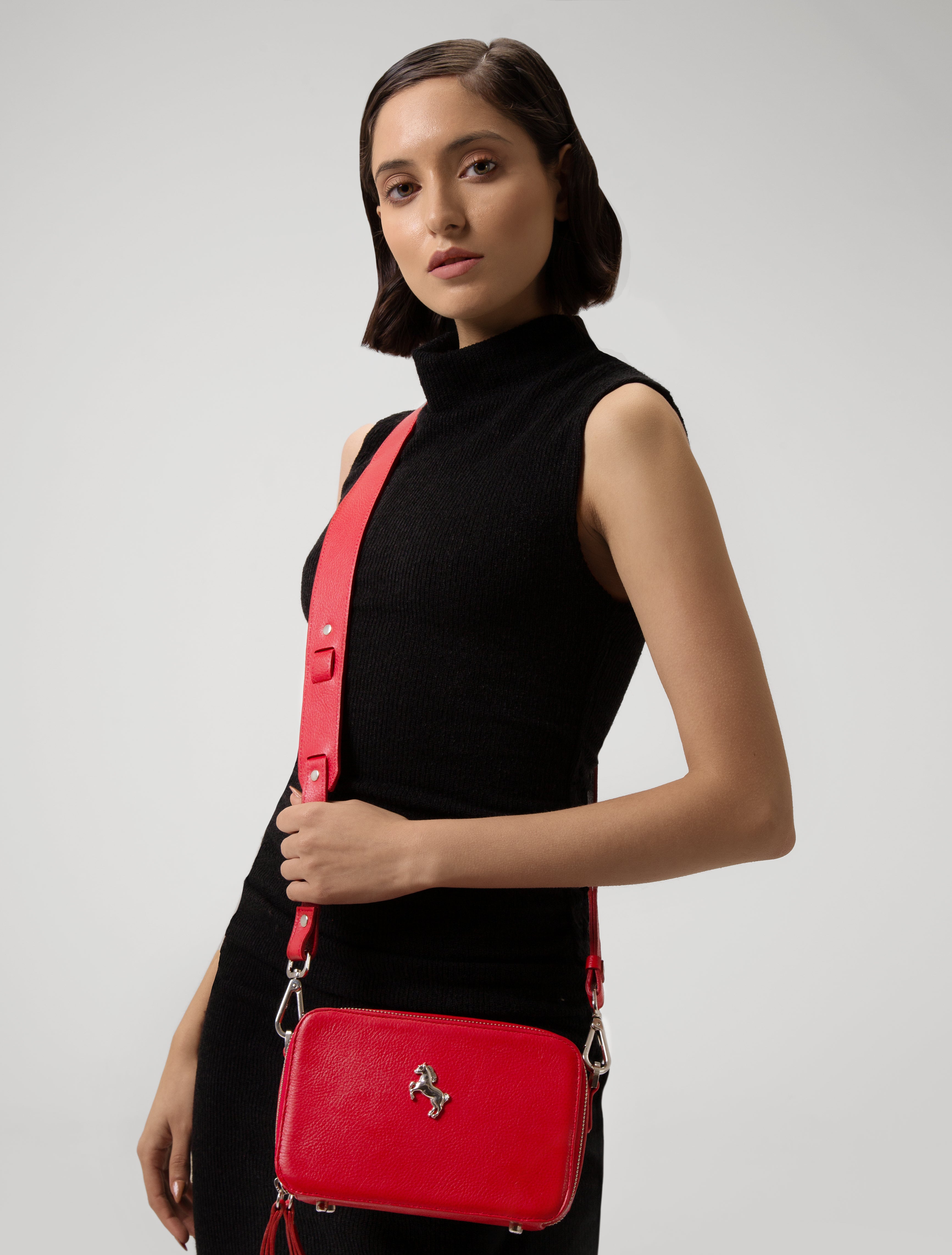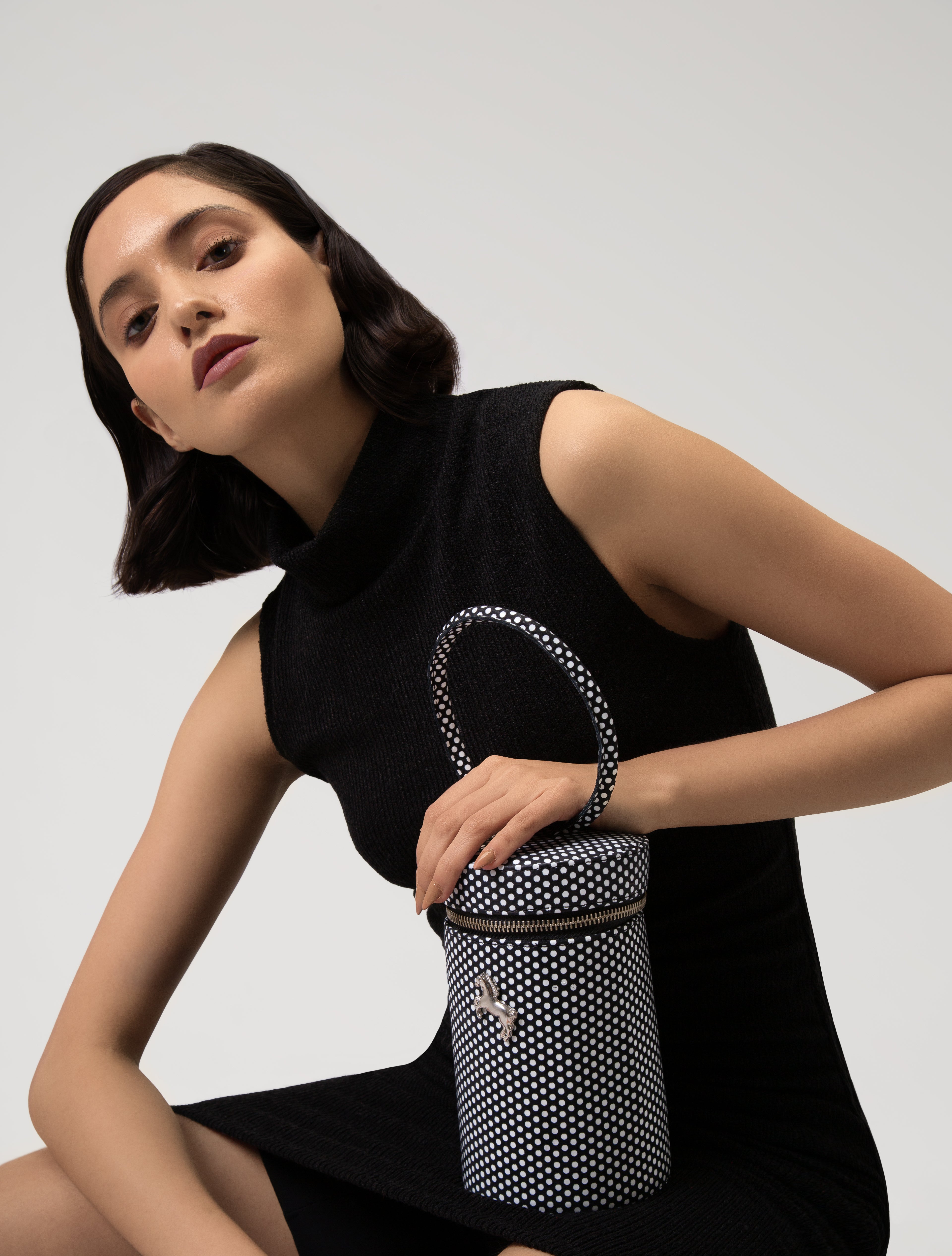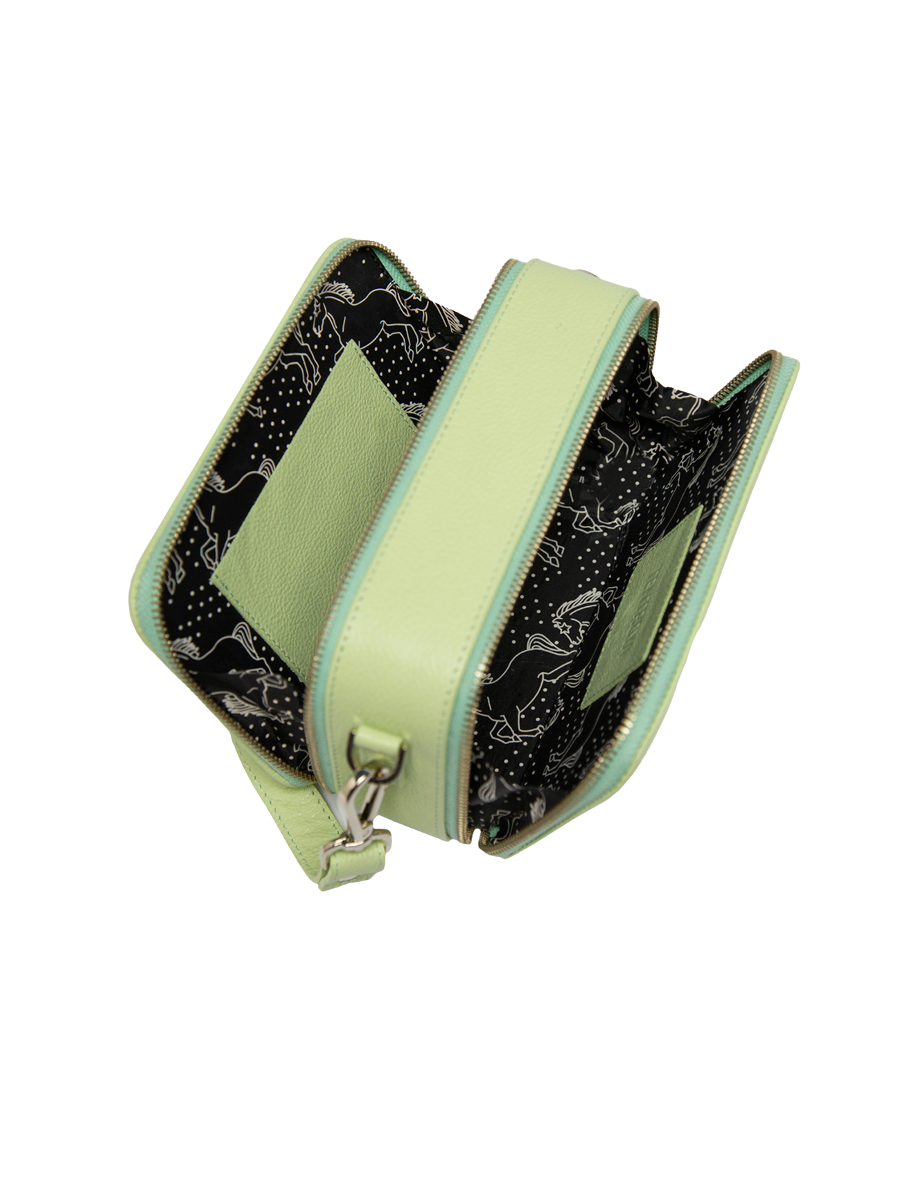 Medium bag with a geometric structure, made of cowhide leather. Includes adjustable and detachable strap for use on the shoulder or crossbody. Lined with our iconic print, it closes with a magnet clasp and has silver hardware.