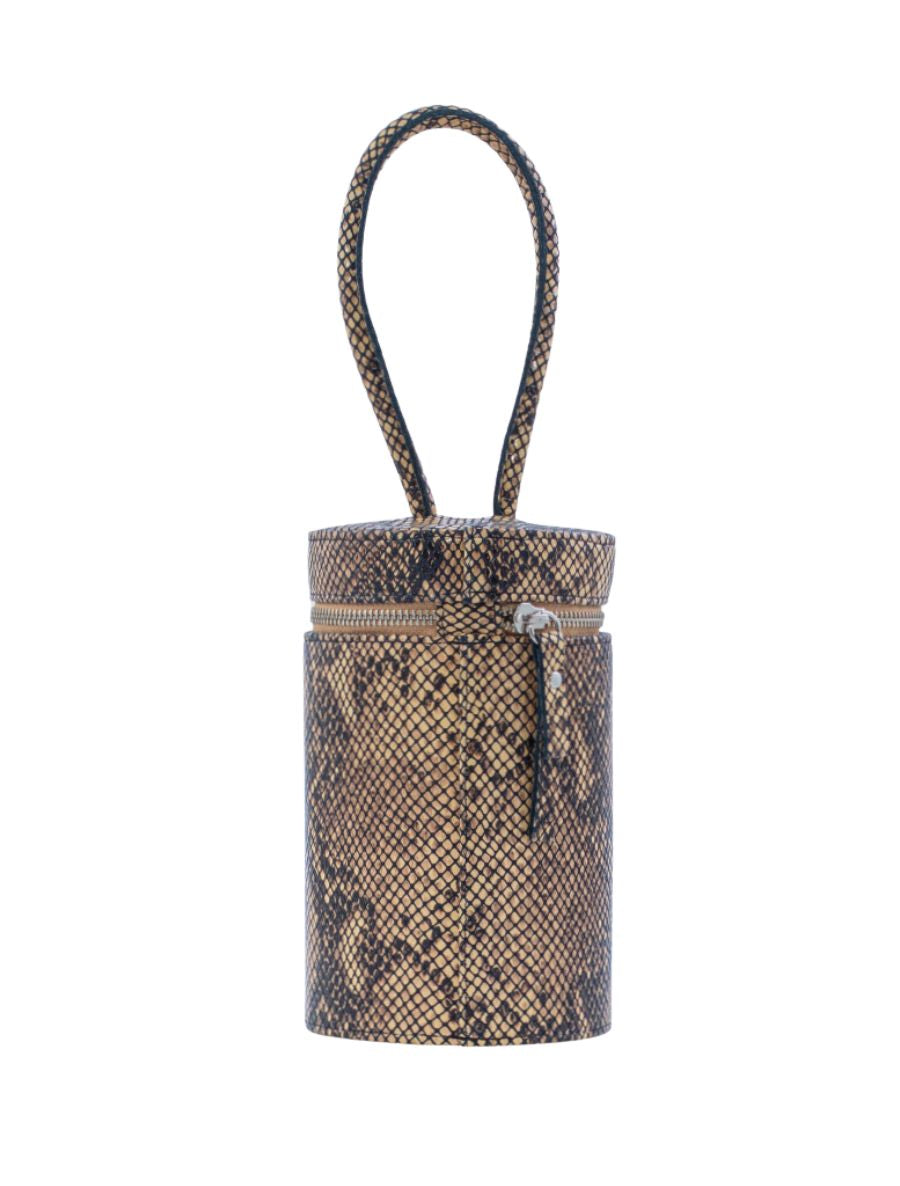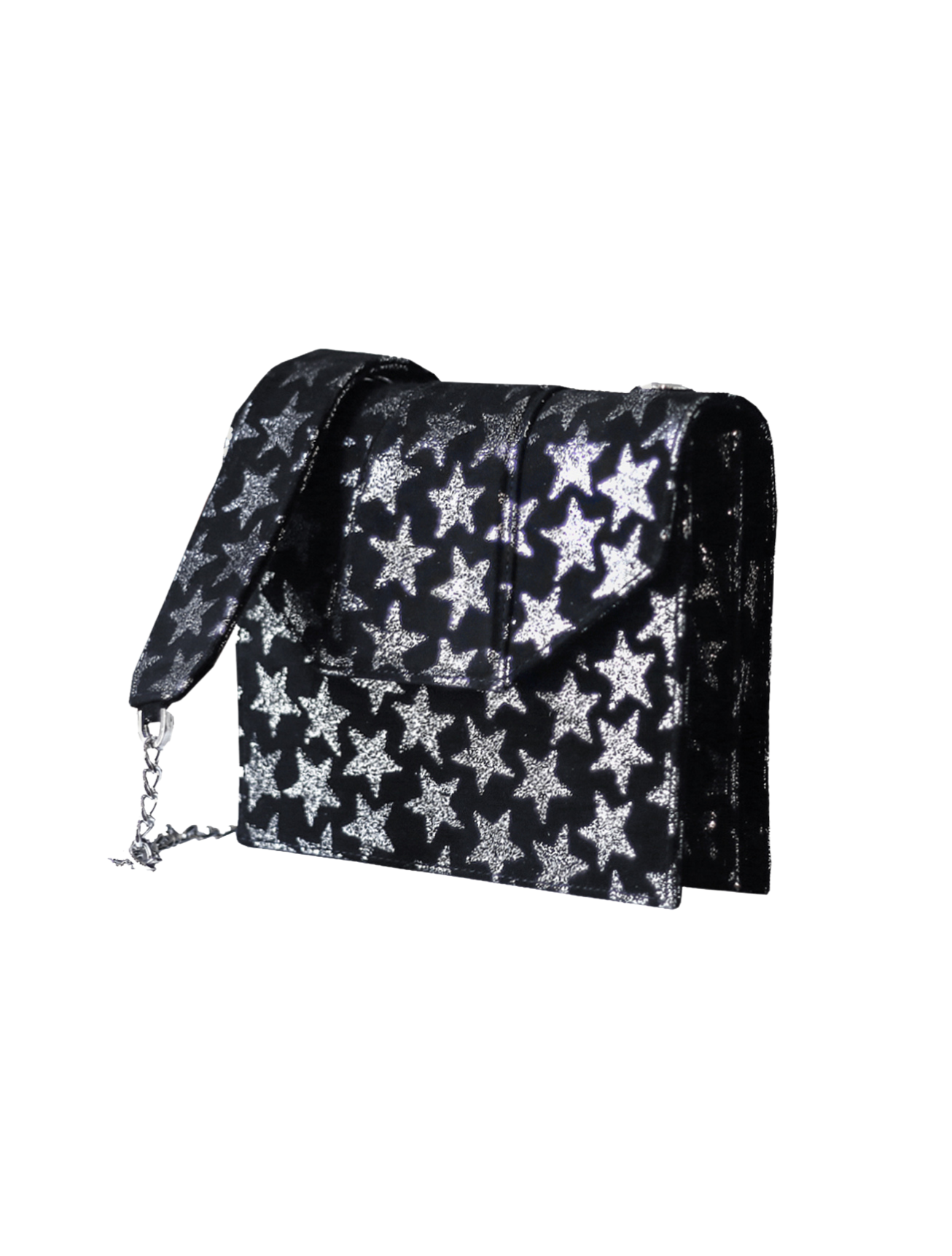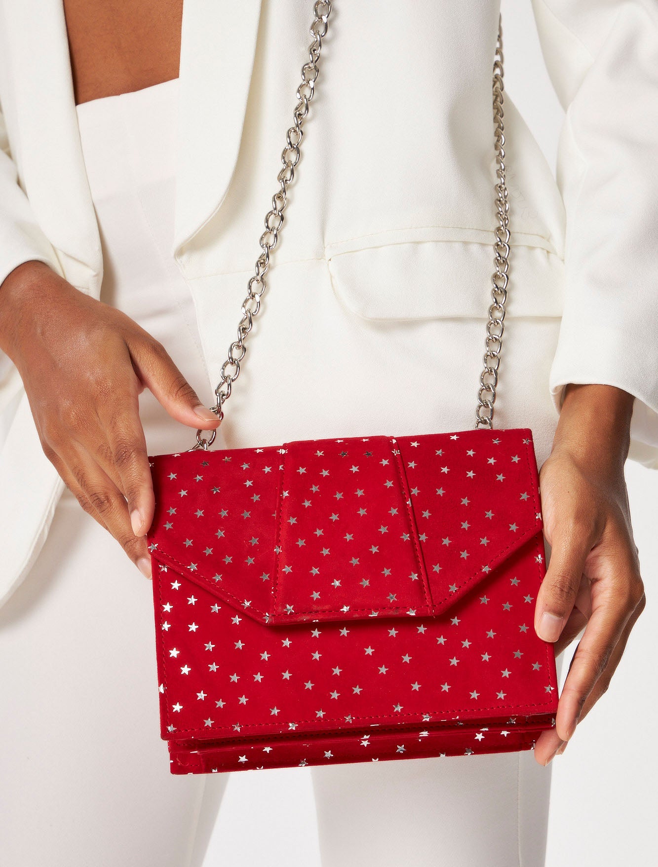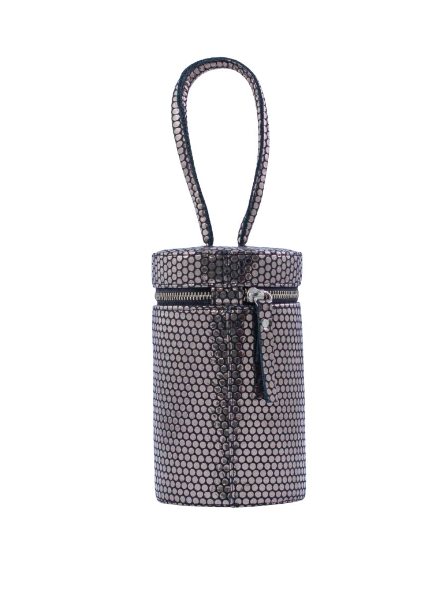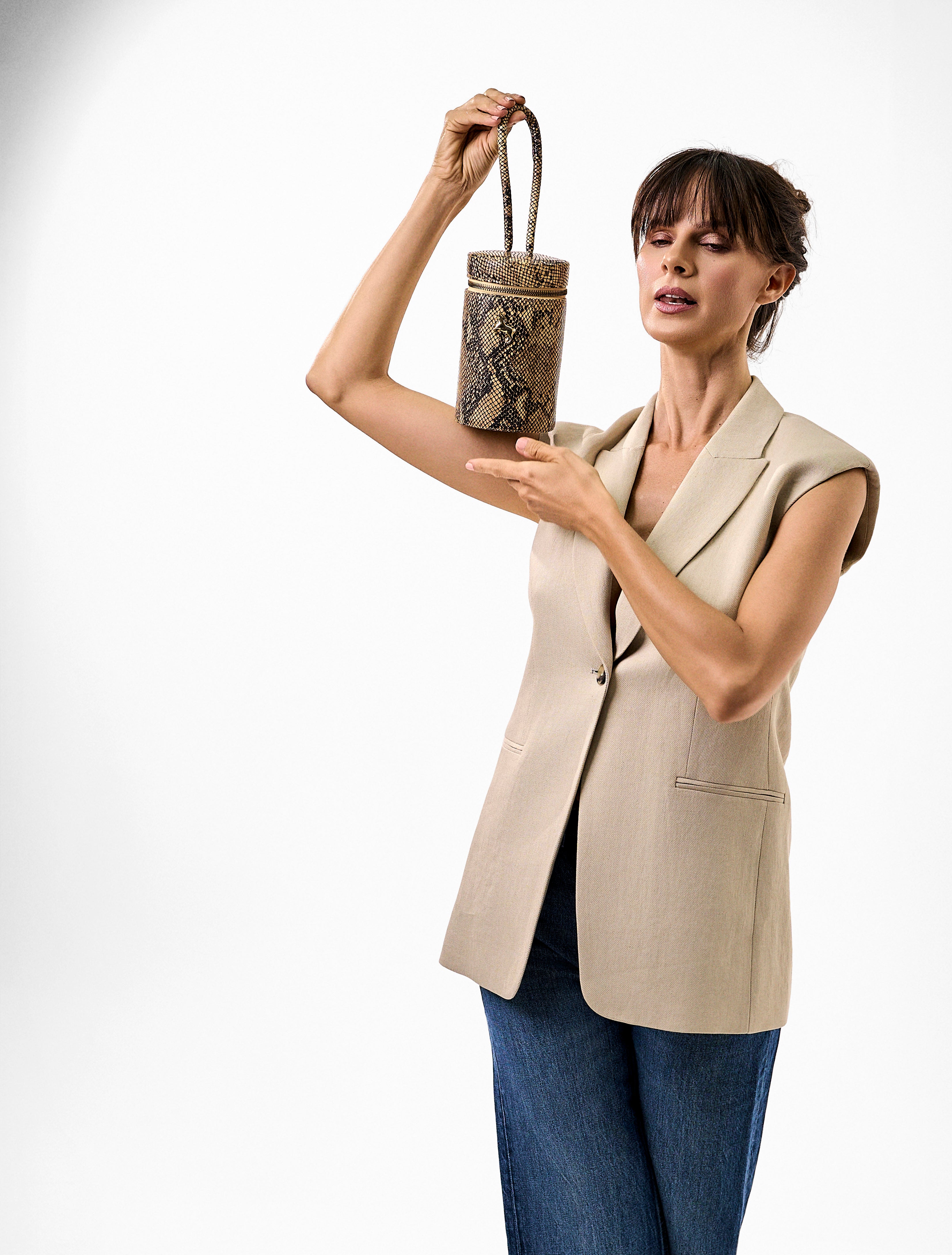 Medium bag with a geometric structure, made of cowhide leather. Includes adjustable and detachable strap for use on the shoulder or crossbody. Lined with our iconic print, it closes with a magnet clasp and has silver hardware.