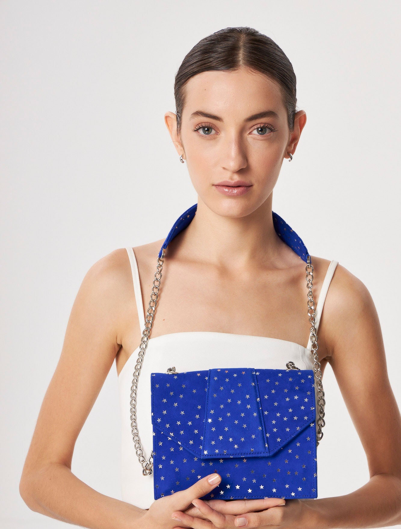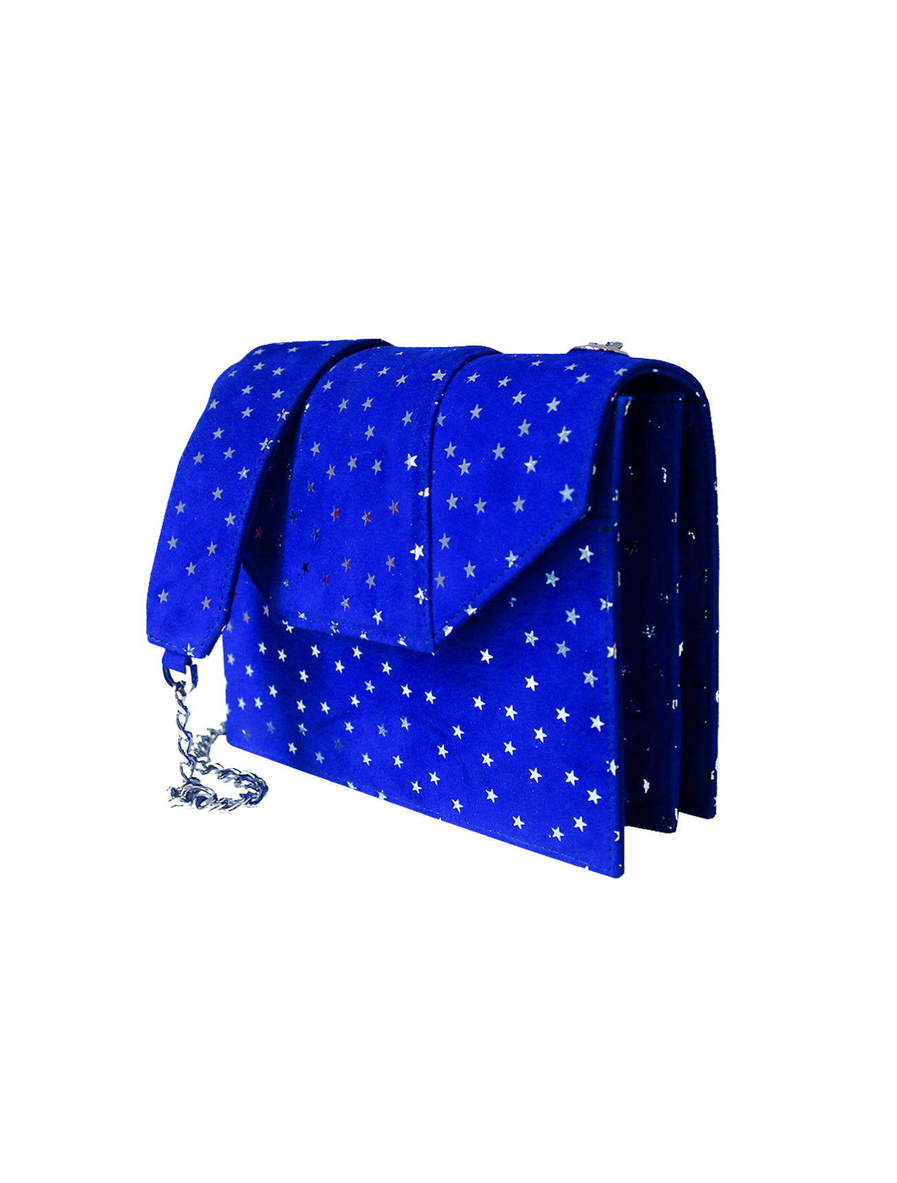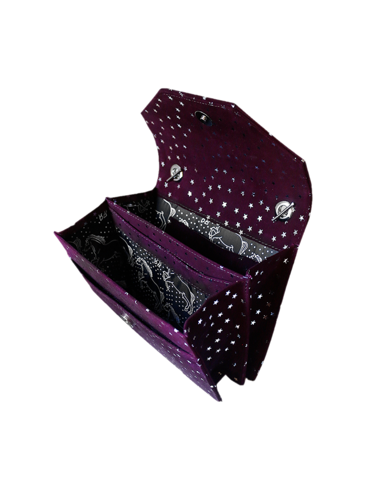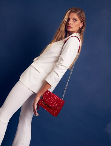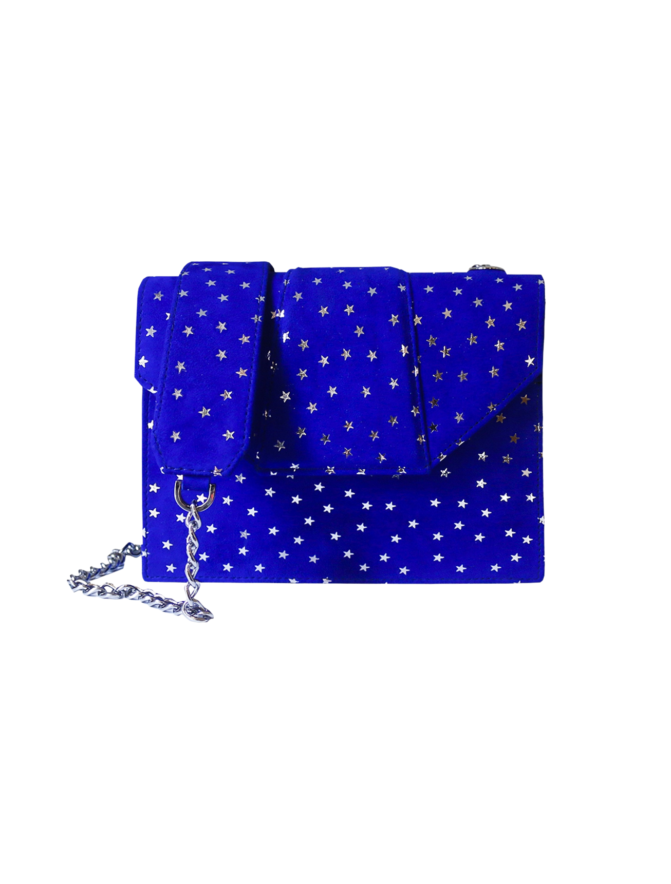 Medium bag with a geometric structure, made of cowhide leather. Includes adjustable and detachable strap for use on the shoulder or crossbody. Lined with our iconic print, it closes with a magnet clasp and has silver hardware.