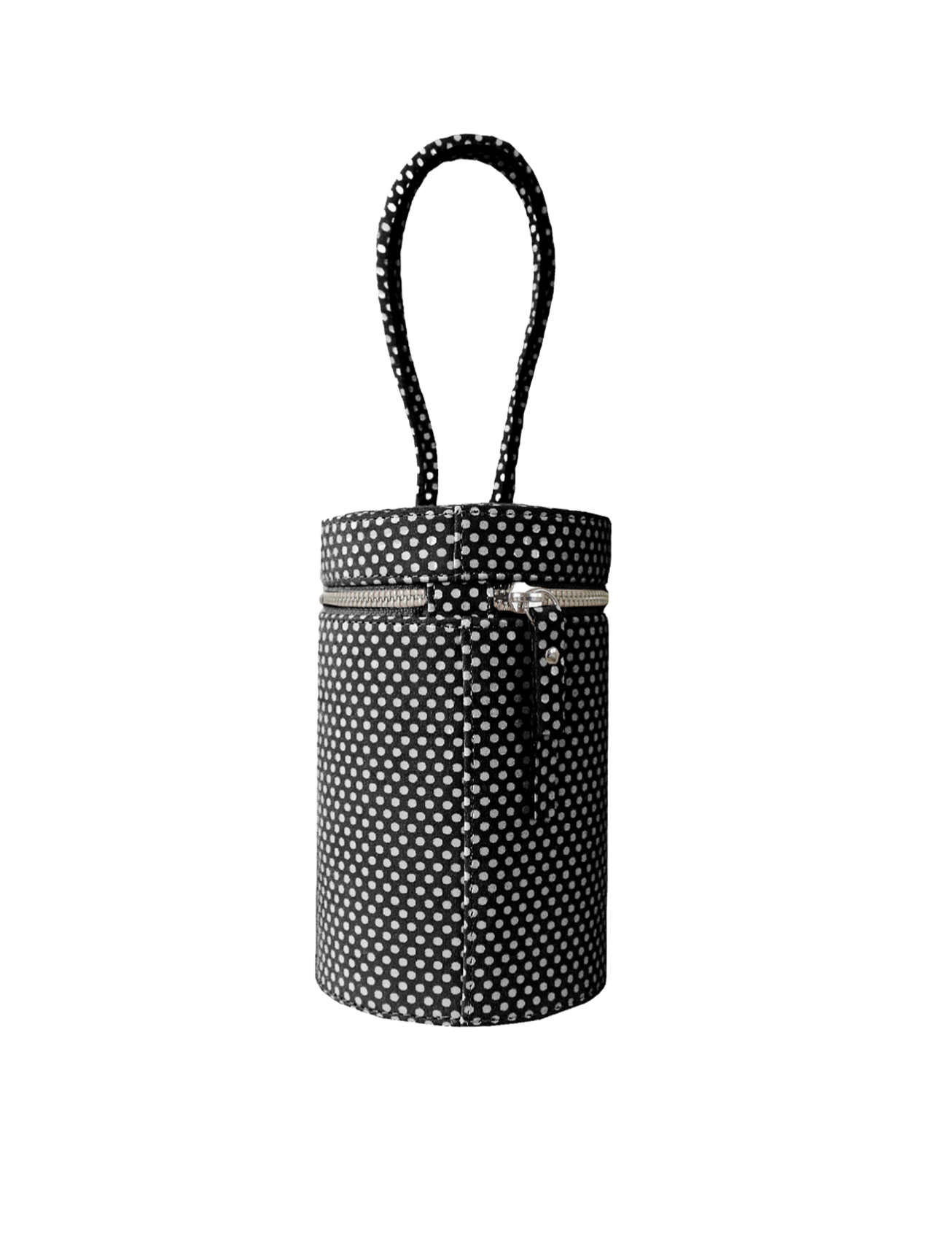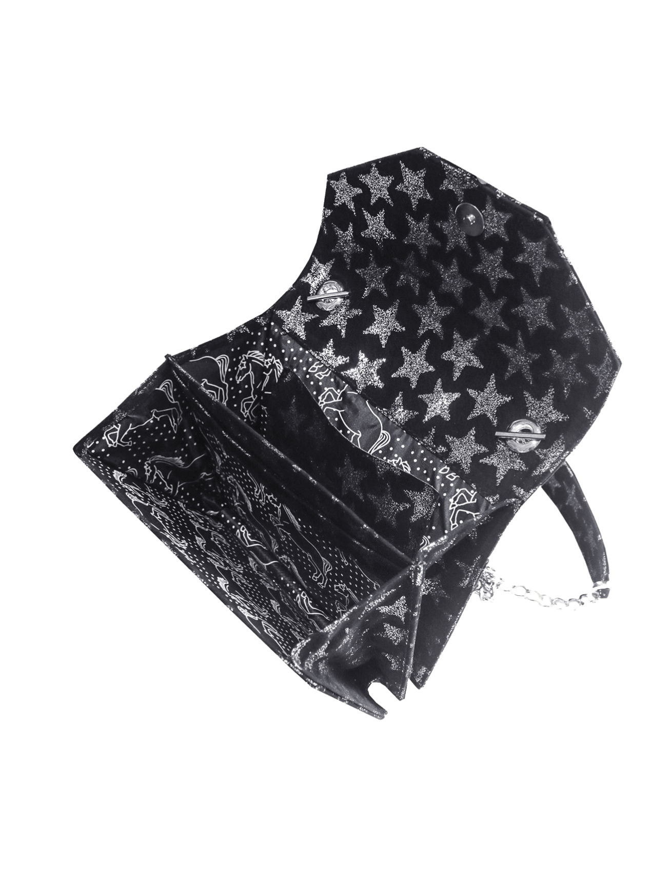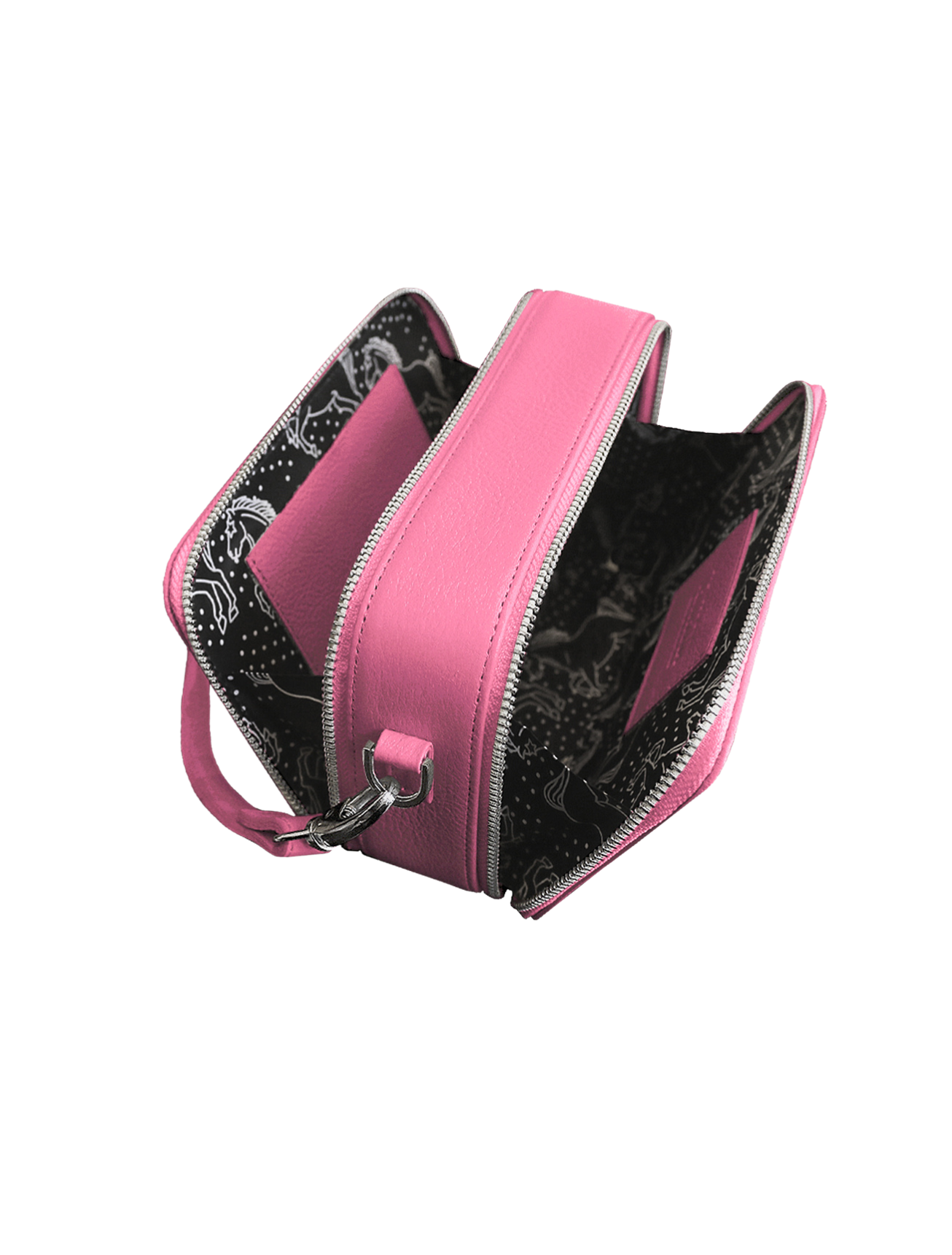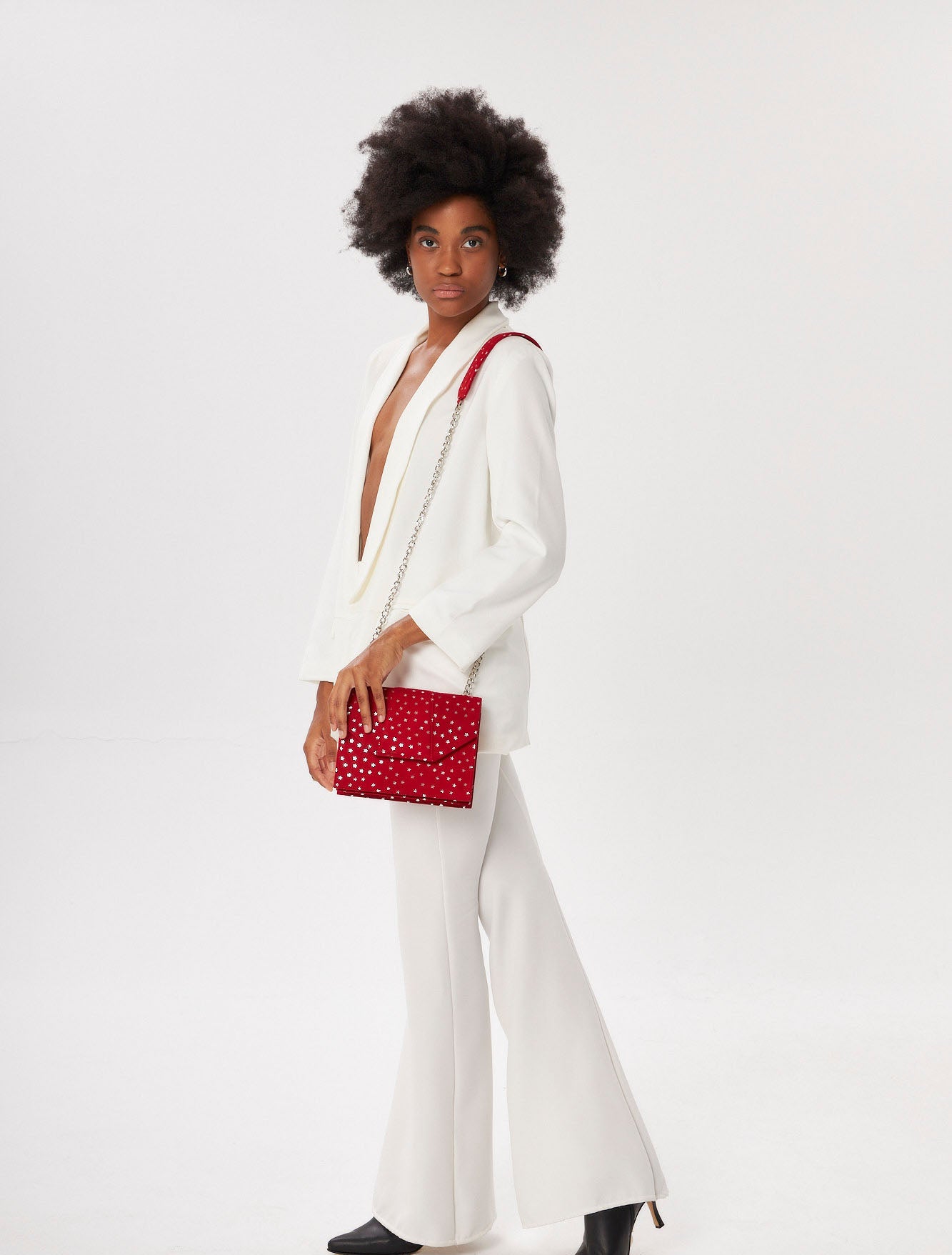 Medium bag with a geometric structure, made of cowhide leather. Includes adjustable and detachable strap for use on the shoulder or crossbody. Lined with our iconic print, it closes with a magnet clasp and has silver hardware.