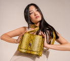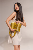 Medium bag with a geometric structure, made of cowhide leather. Includes adjustable and detachable strap for use on the shoulder or crossbody. Lined with our iconic print, it closes with a magnet clasp and has silver hardware.
