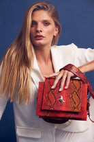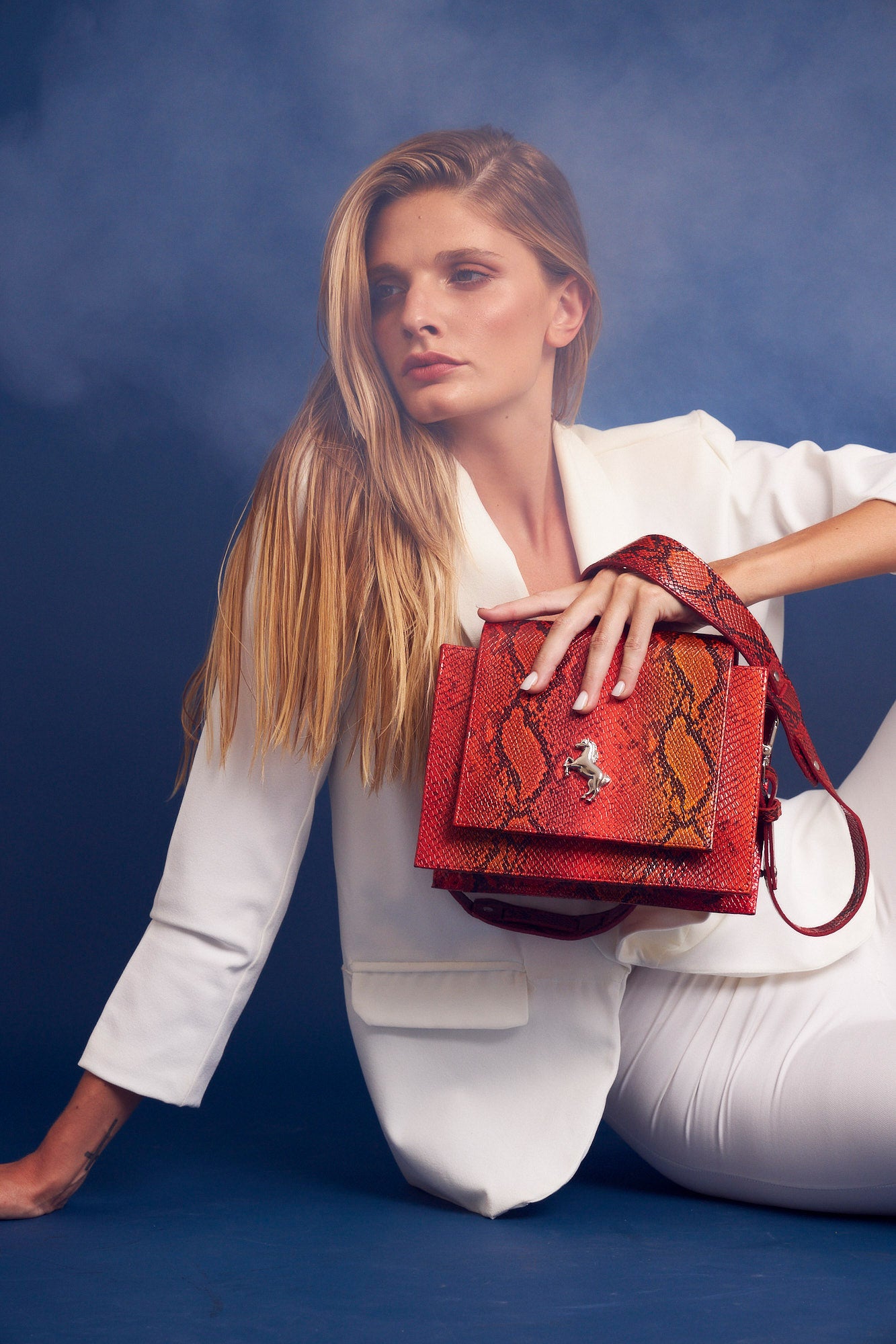 Medium bag with a geometric structure, made of cowhide leather. Includes adjustable and detachable strap for use on the shoulder or crossbody. Lined with our iconic print, it closes with a magnet clasp and has silver hardware.