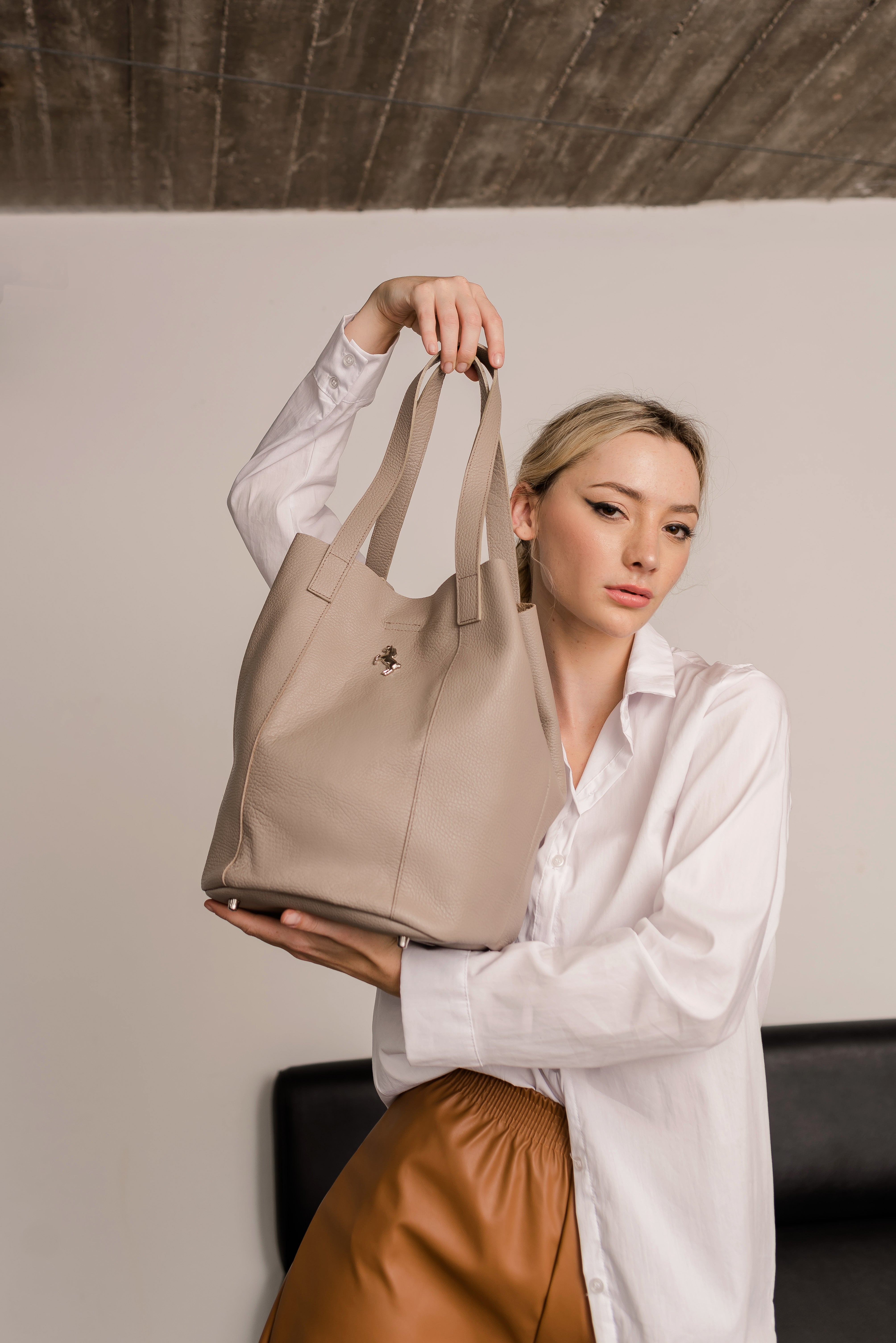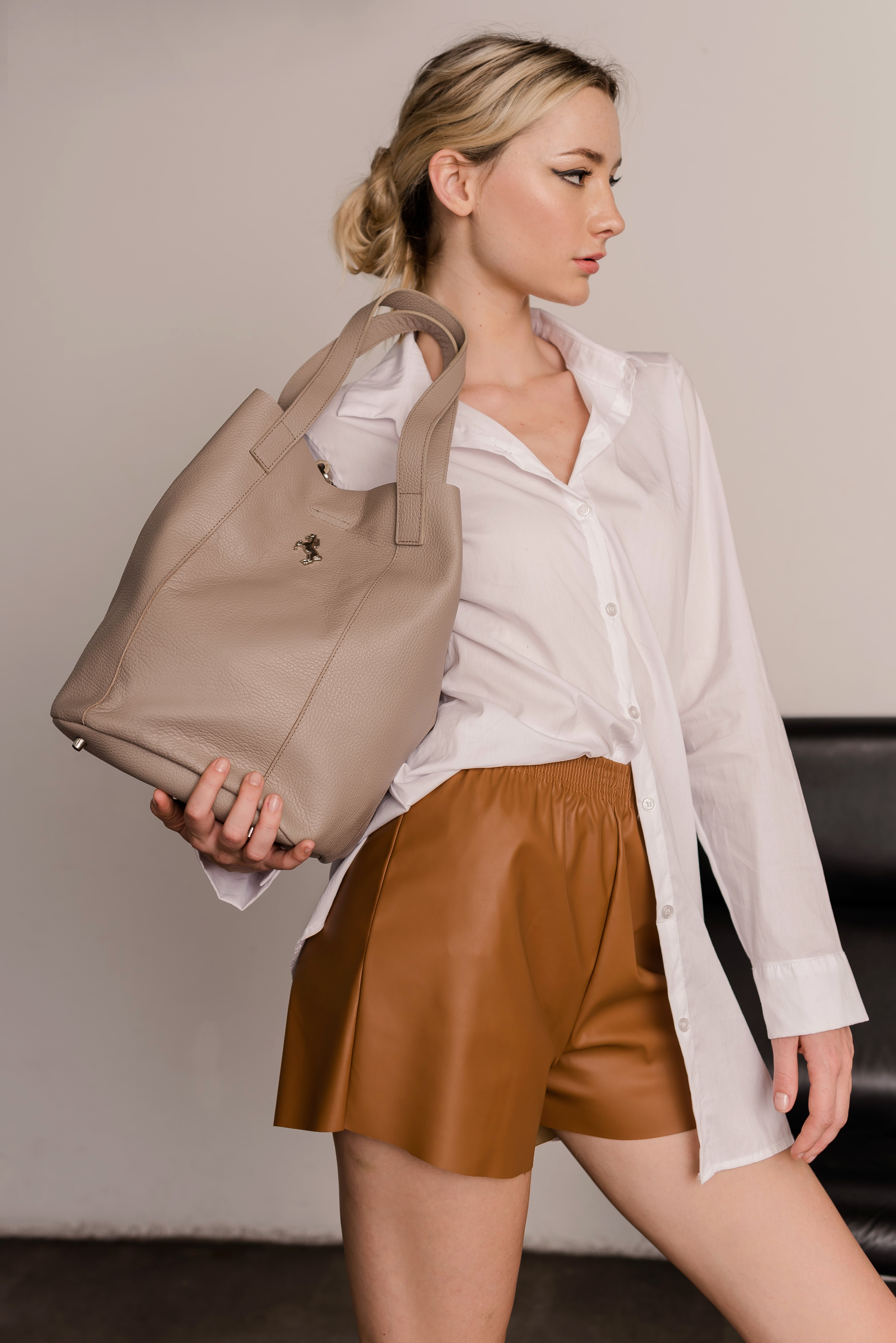 Medium genuine leather bag, with reinforced base, detachable strap and internal zippered pocket. Designed for daily use, its size allows you to carry everything you need. Includes silver hardware and nails on the bottom for greater protection.