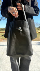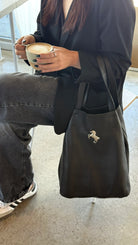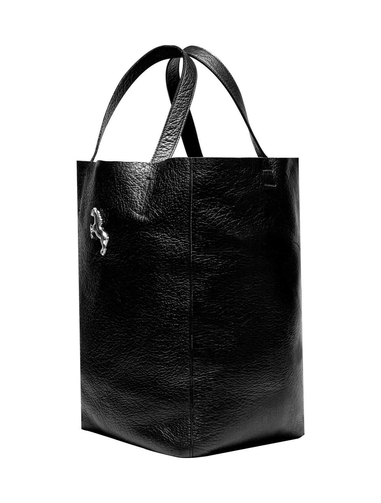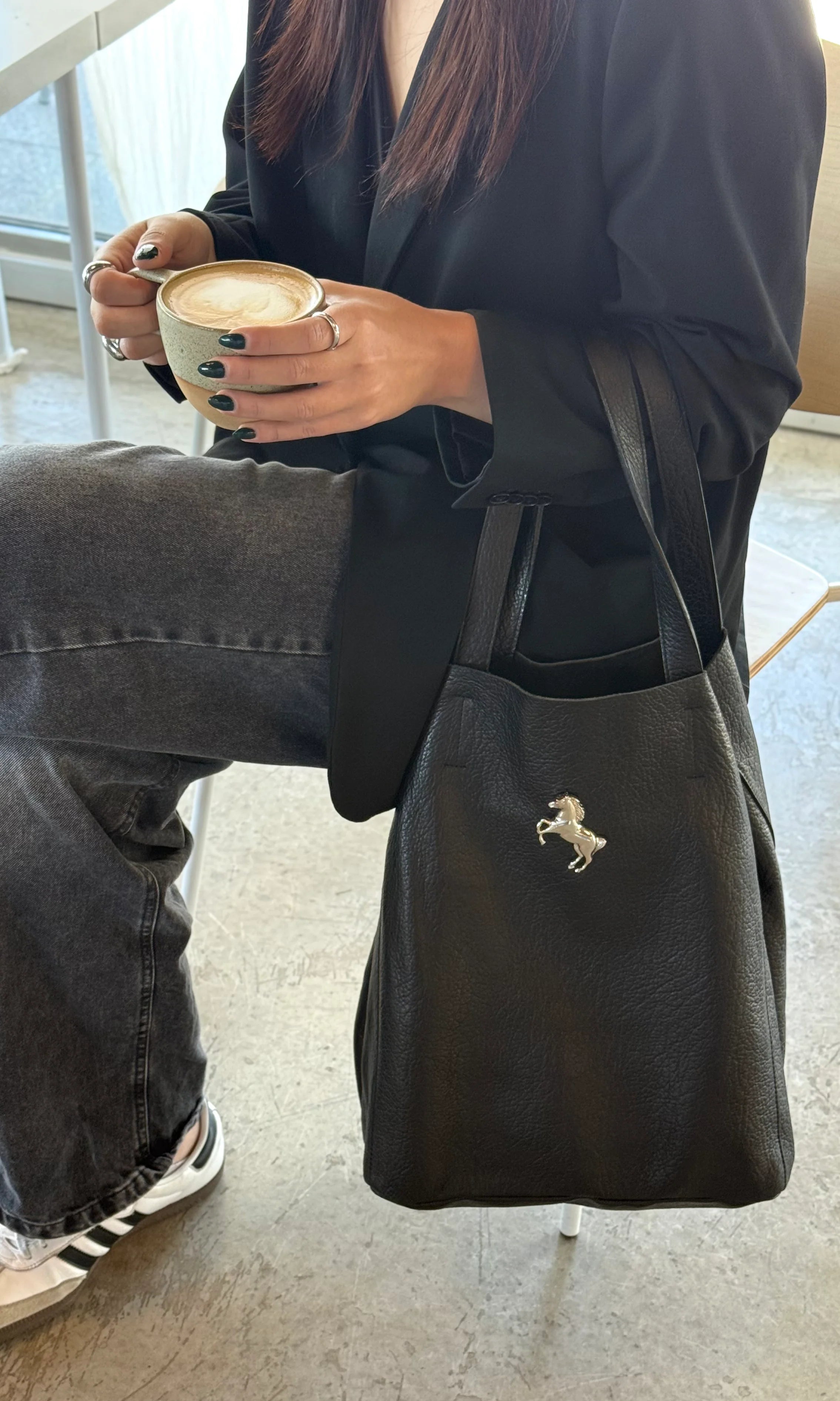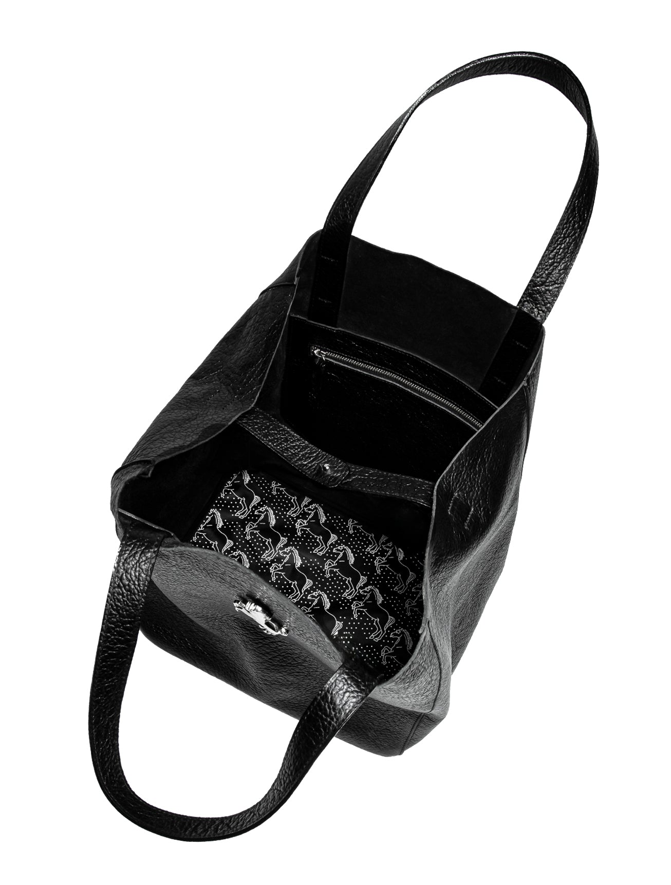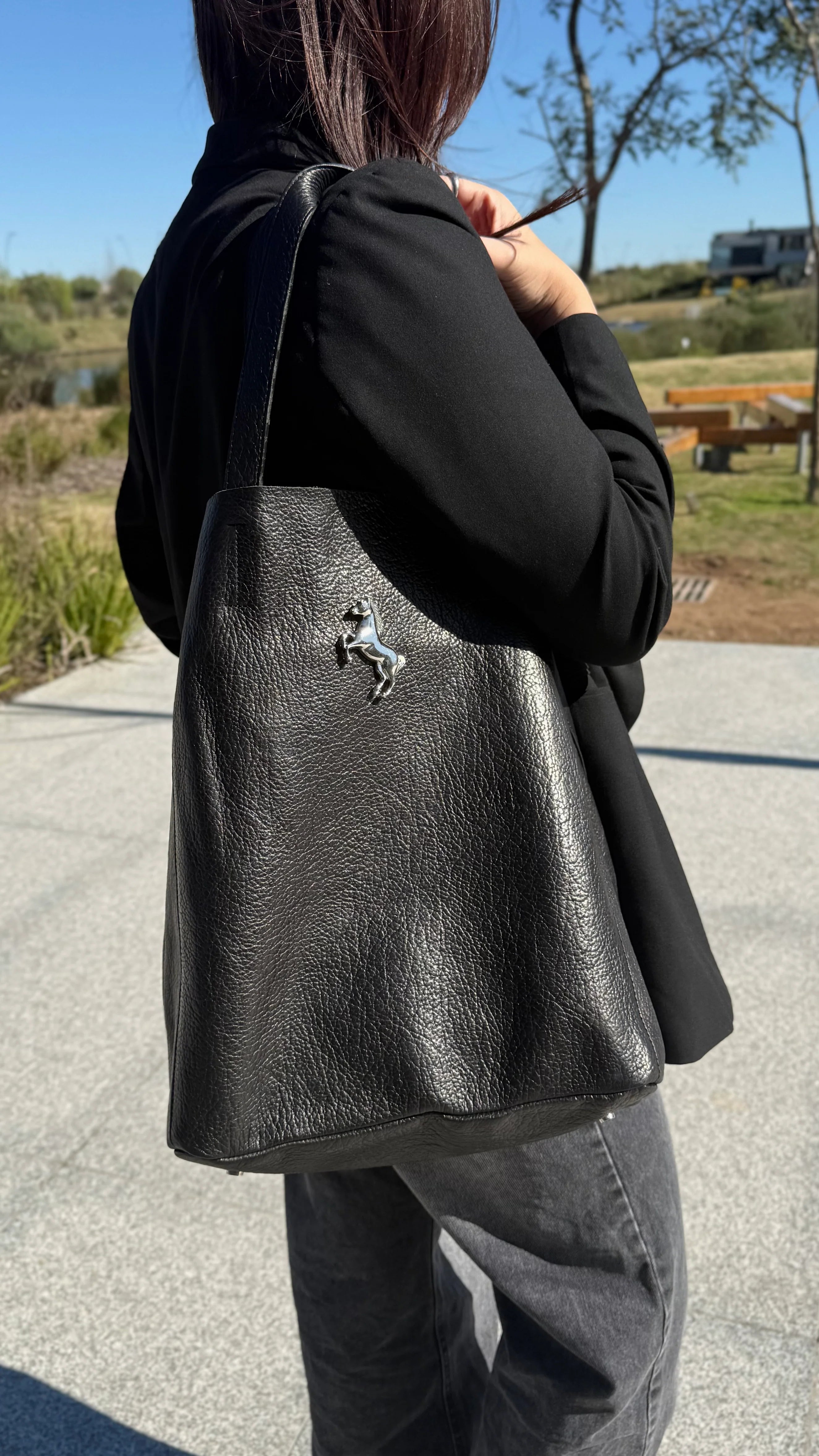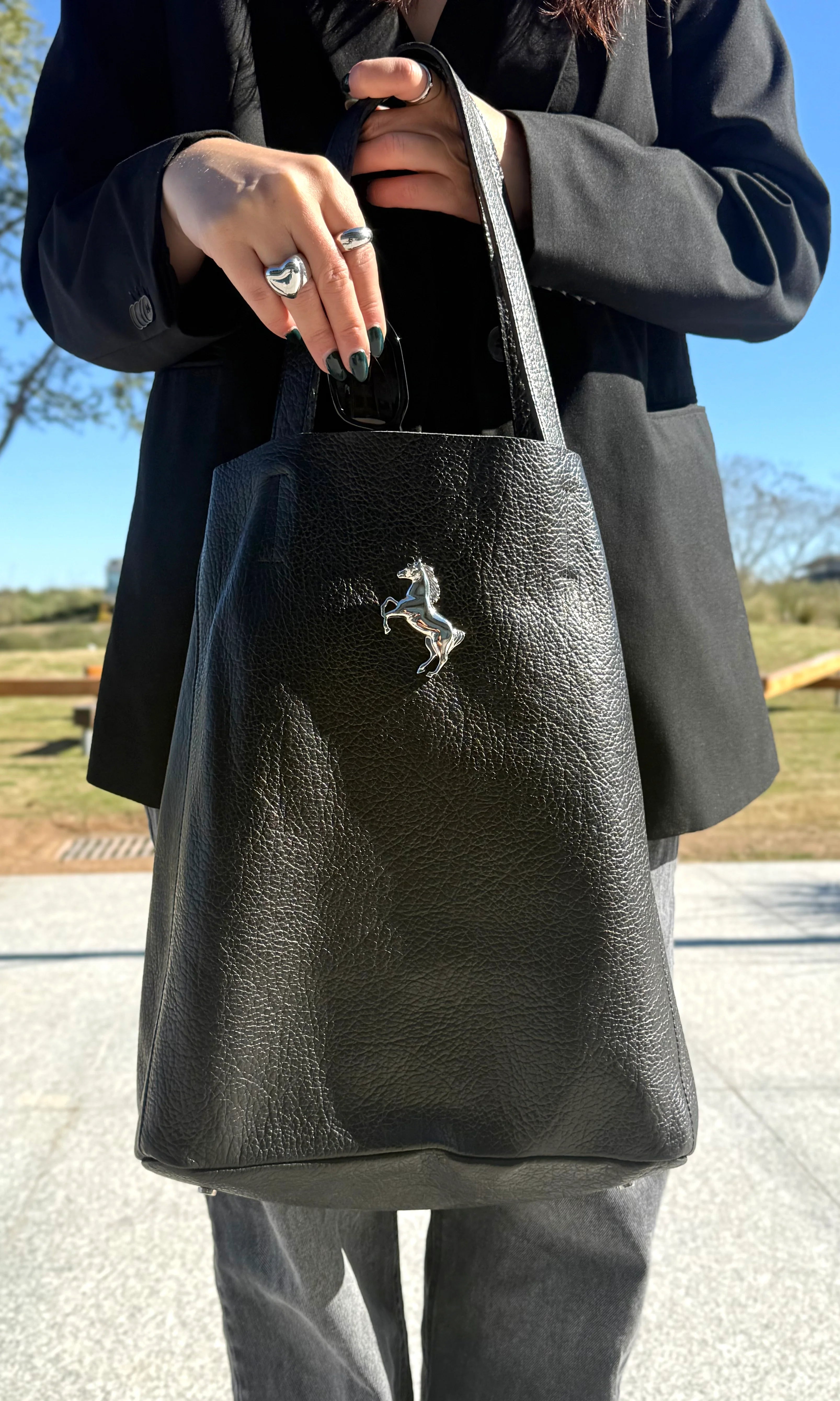 Maxi bag crafted from genuine cowhide leather, featuring a soft, fluid structure that makes it perfect for everyday use. Unlined, with a reinforced base and silver-tone hardware adorned with the brand’s signature horse emblem, it offers exceptional capacity.
