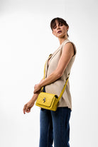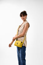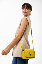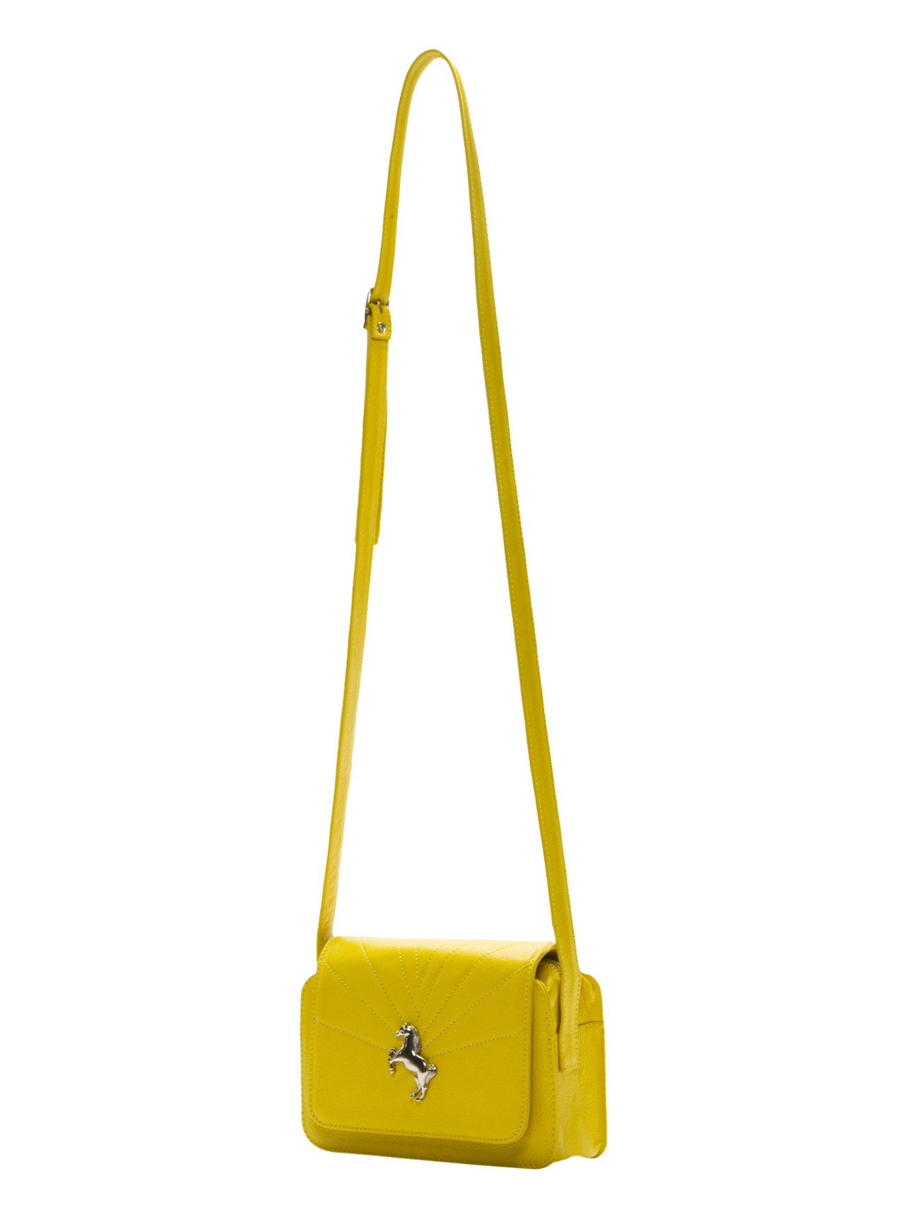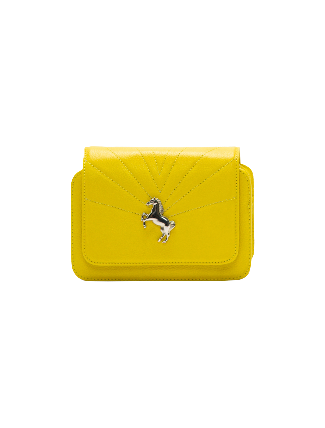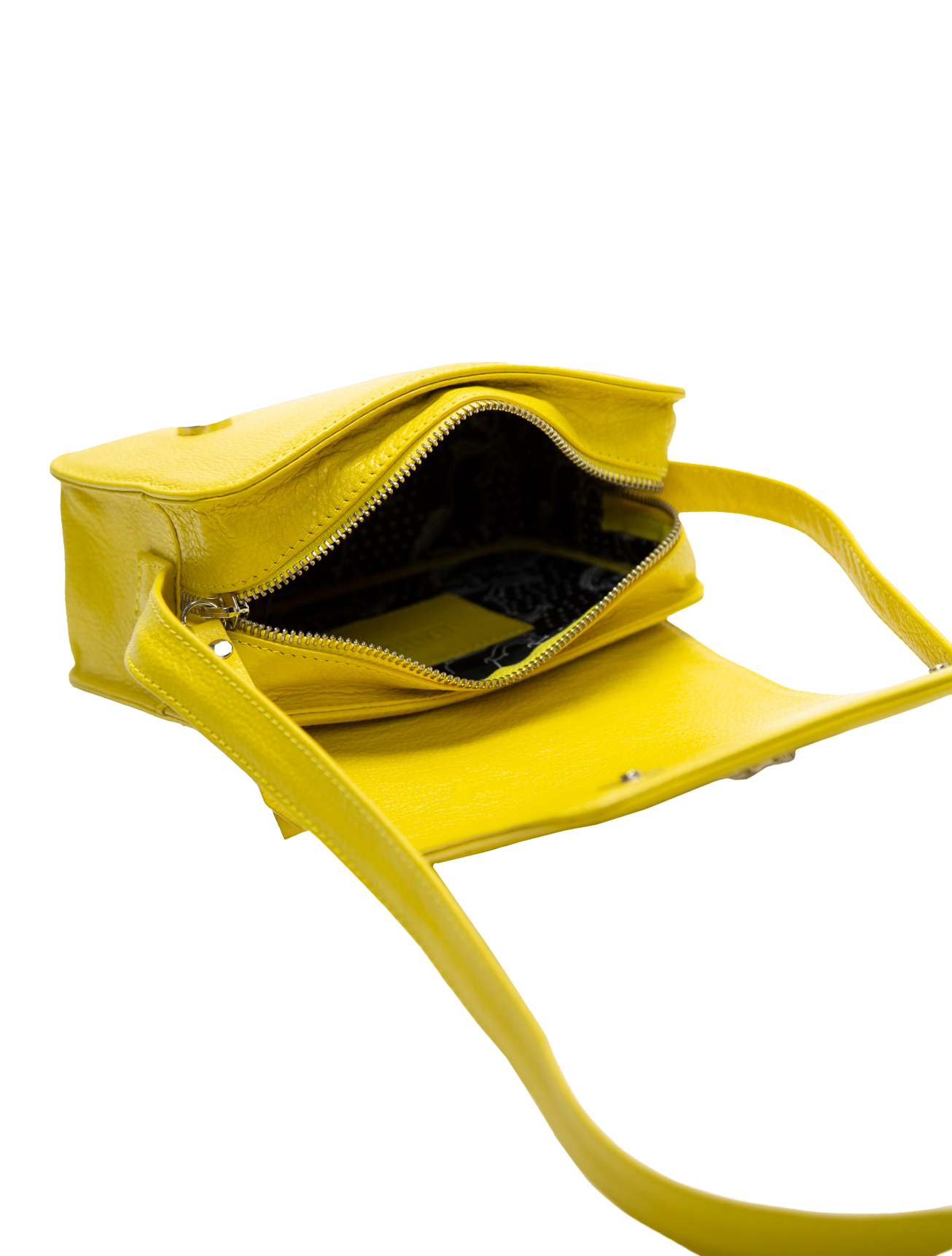 Small handbag made in genuine leather with small grain, flap with stitching and silver hardware.